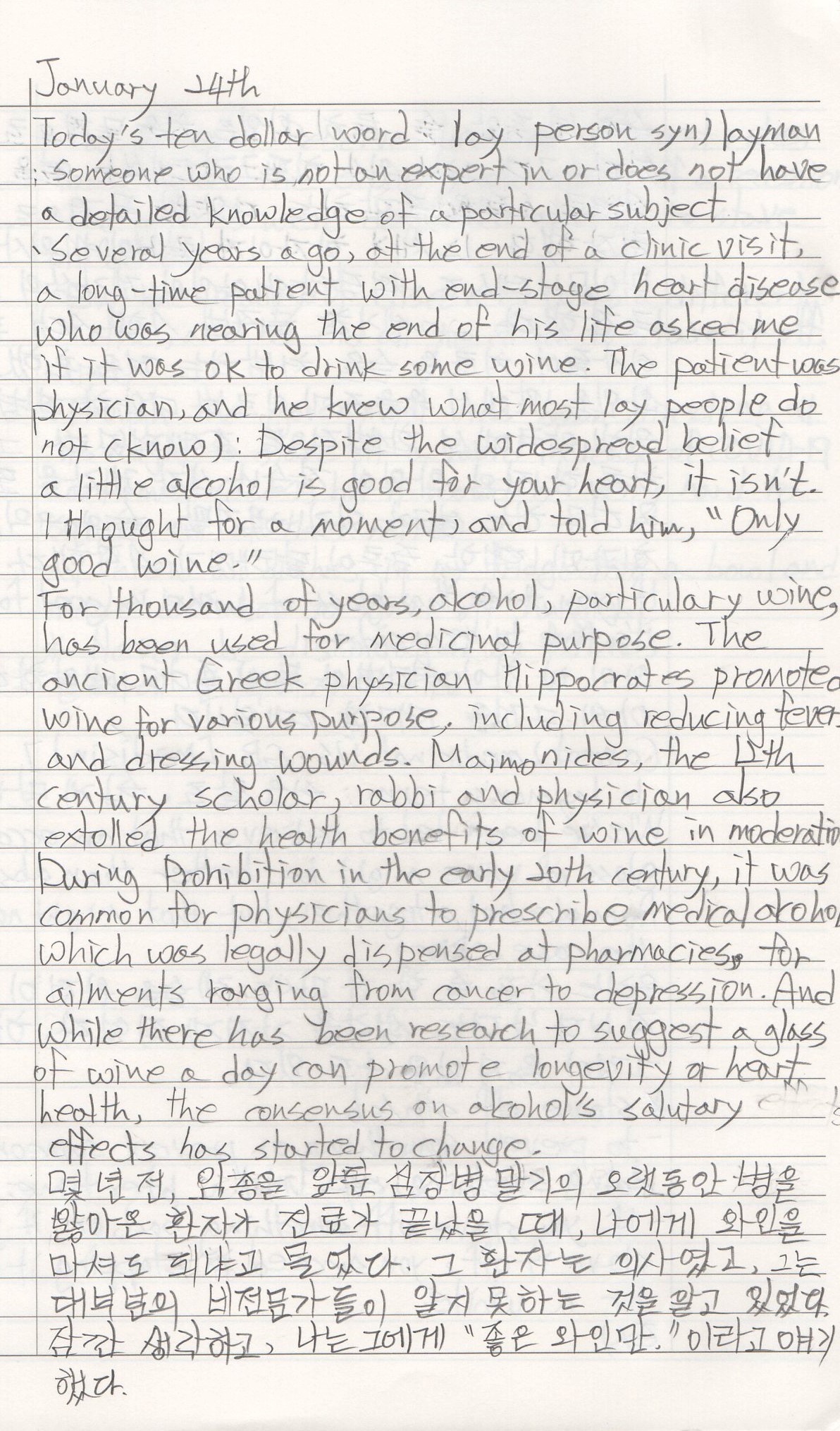 몇 년 전, 임종을 앞둔 심장병 말기의 오랫동안 병을 앓아온 환자가 진료가 끝났을 때, 나에게 와인을 마셔도 되냐고 물었다. 그 환자는 의사였고 그는 대부분의 비전문가들이 알지 못하는 것을 알고 있었다. 소량의 술이 사람들의 심장에 좋다는 널리 알려진 통념에도 불구하고 그렇지 않다. 잠깐 생각하고 나는 그에게 "좋은 와인만,"이라고 얘기했다.